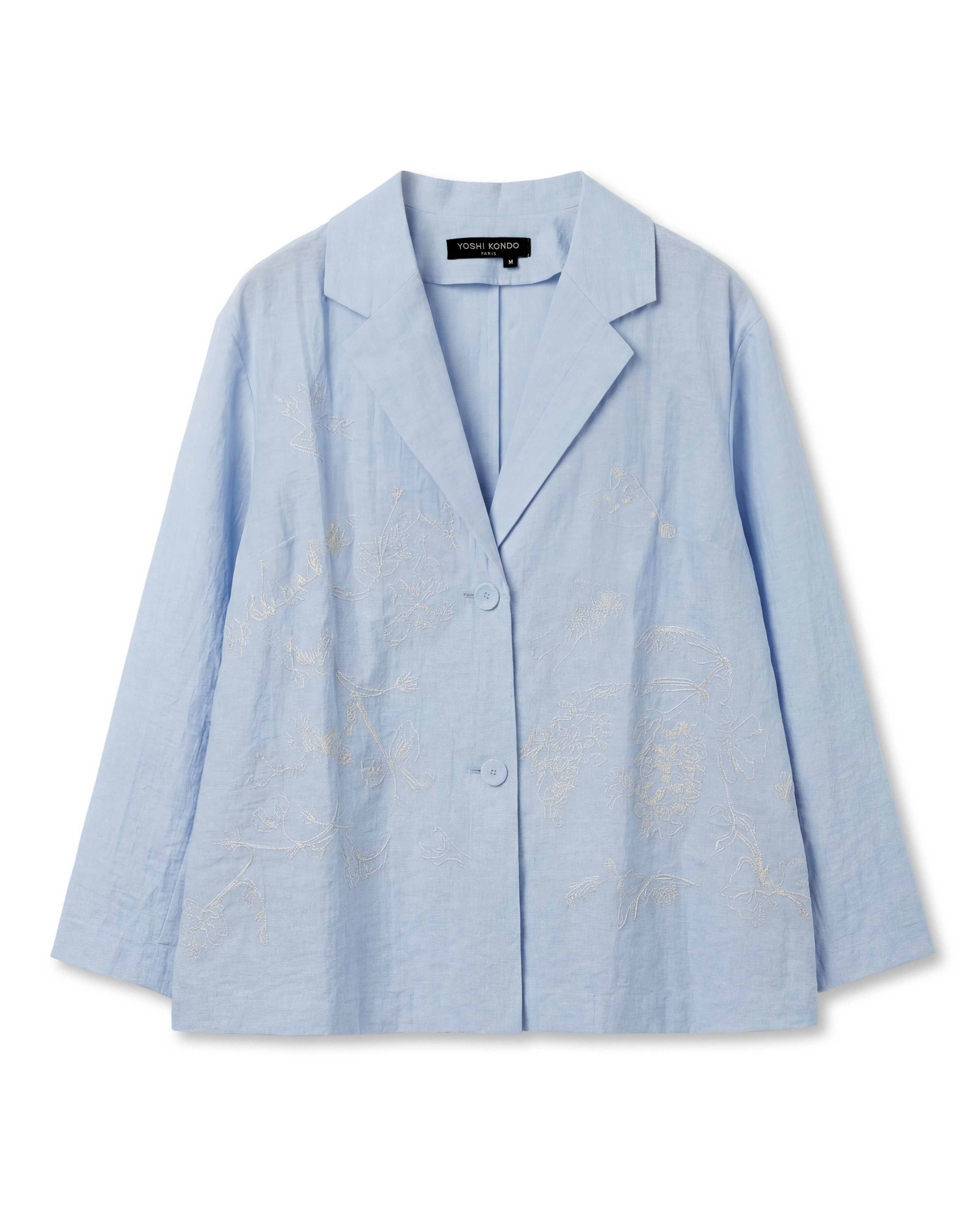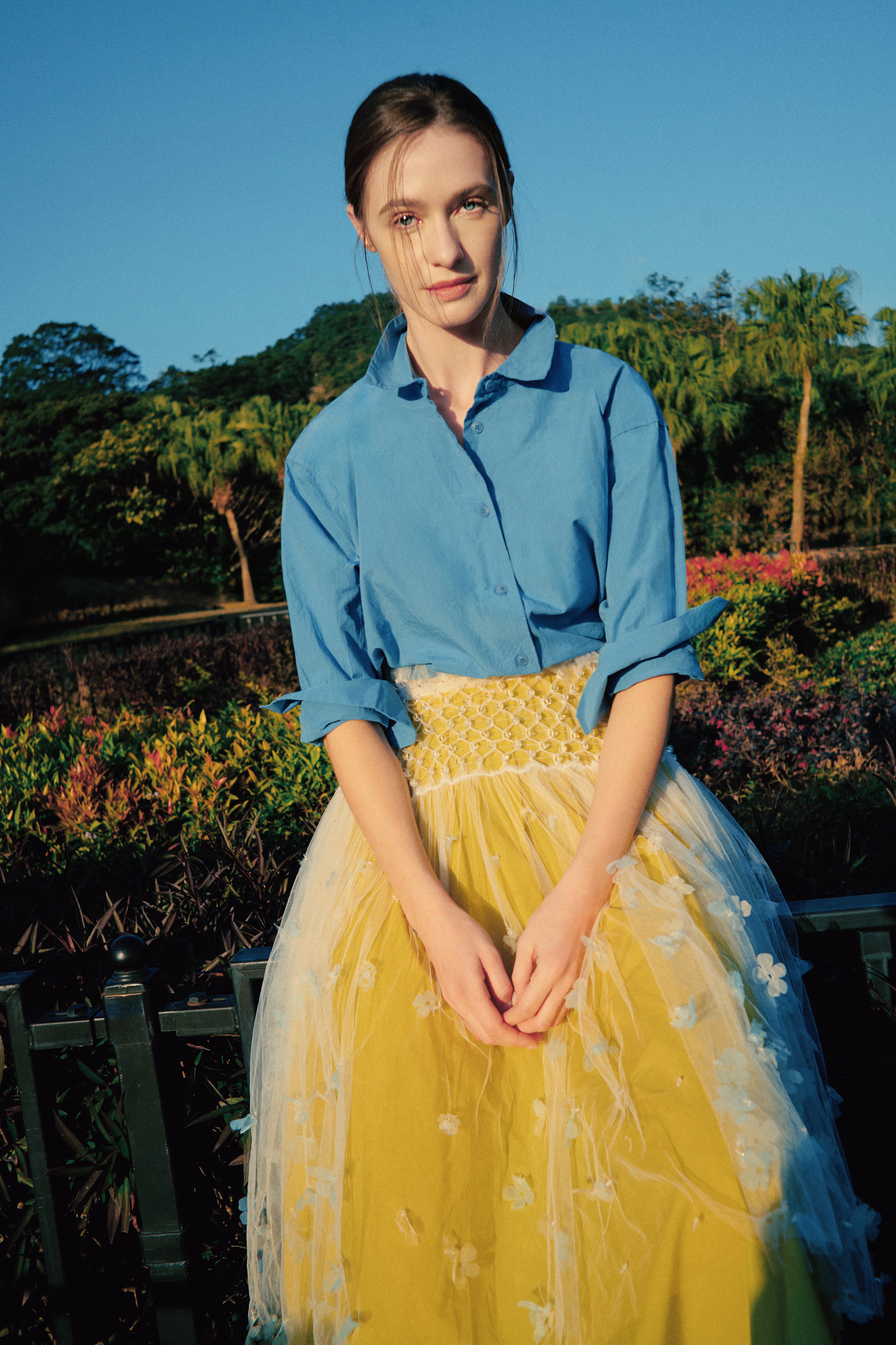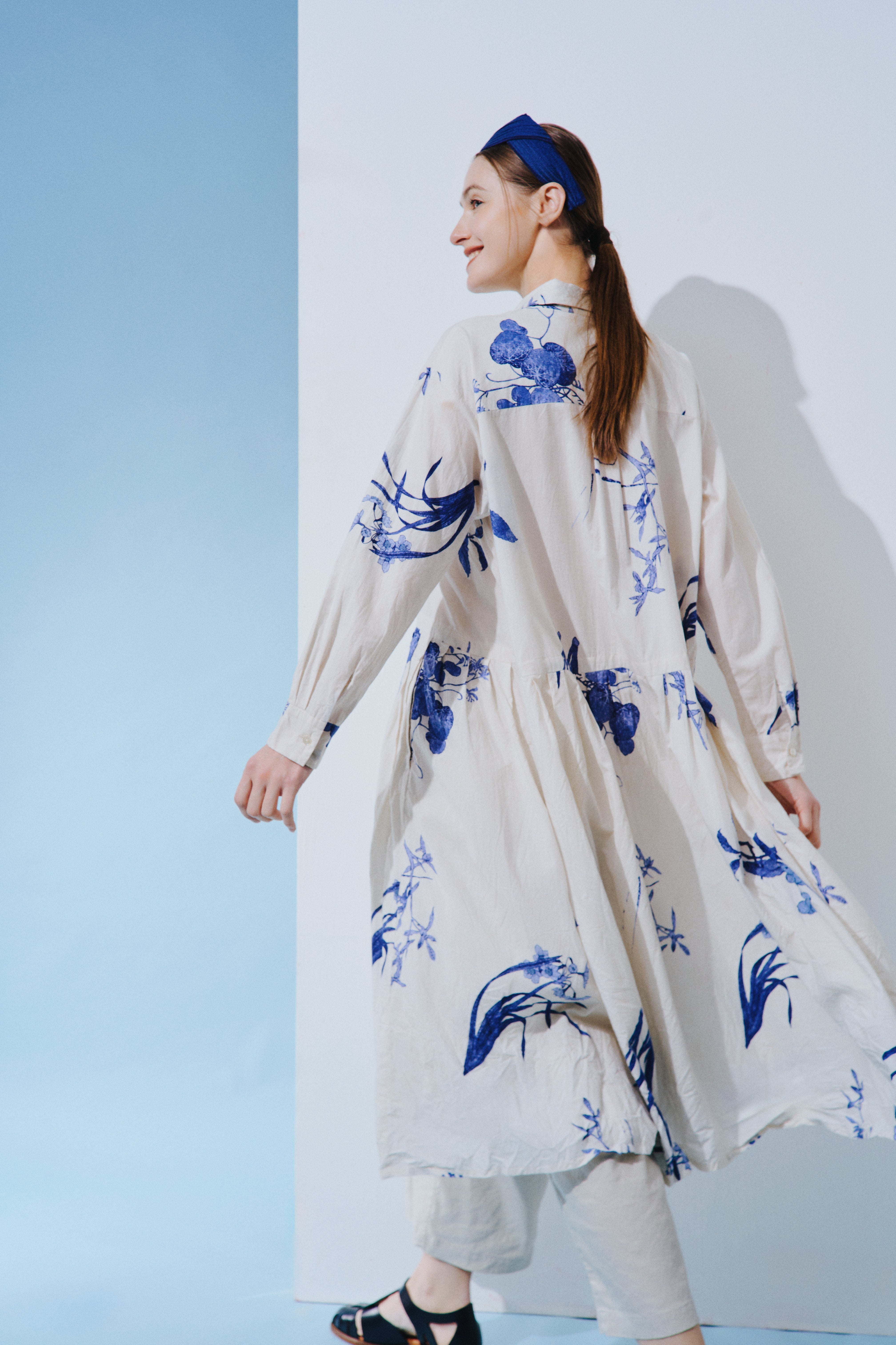 Pas de Calais, the Japanese brand known for its unique fabrics made with natural dyes, presented floral dresses in light blue tones, exuding a relaxed, vacation-ready vibe.