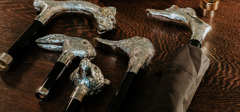 This umbrella comes with a choice of different Nickel (Silver) Finish Animal heads on a straight stem handle with Nickel Tip Cup, the umbrella is made on a 25" Classic Fox Steel Tube Frame (brown tube with black ribs) with a Best Polyester cover/canopy. This umbrella also comes with a matching outside case to help keep the umbrella clean when stored.